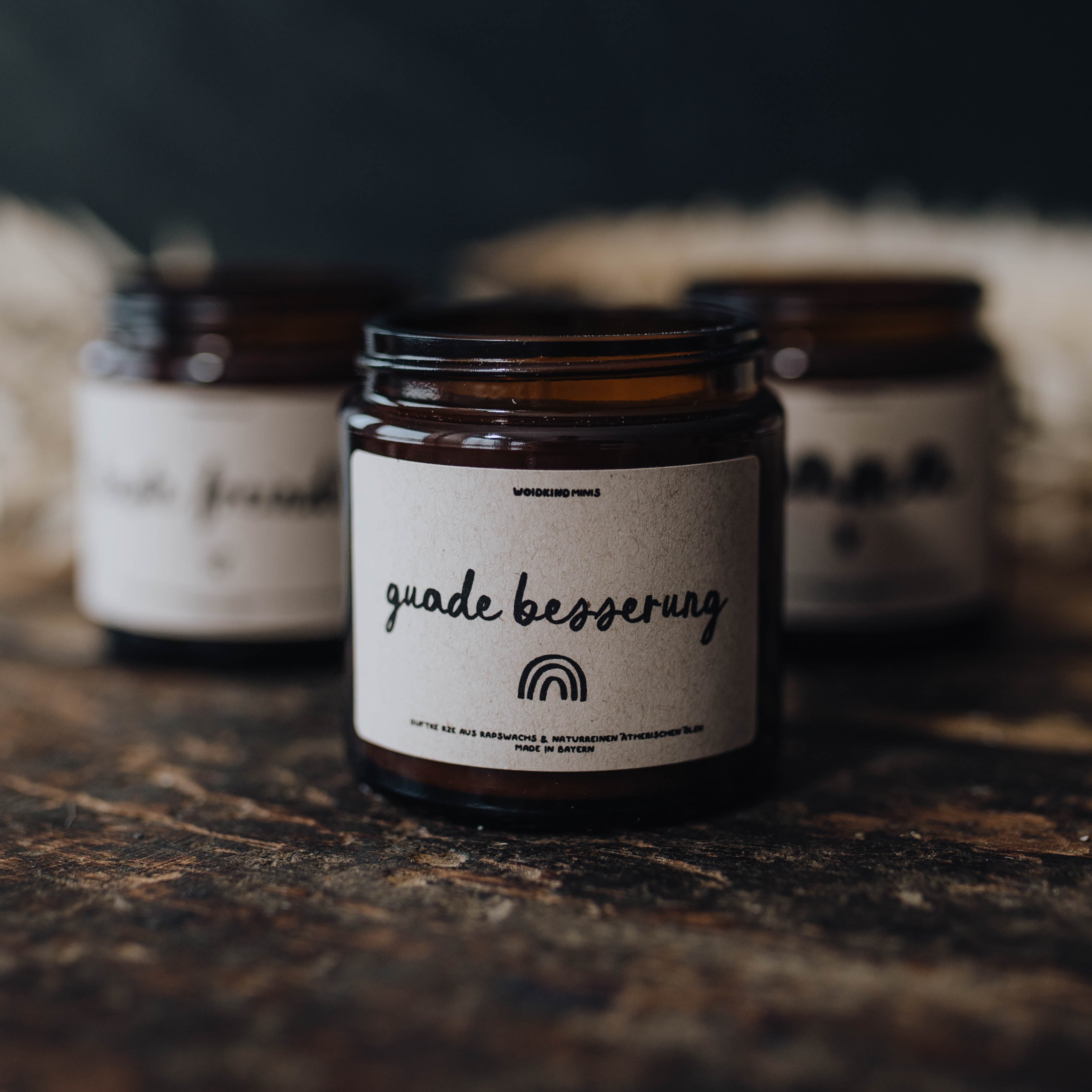 Wähle deinen Lieblingsduft für deine Minikerze aus vier Woidkind Hausdüften: